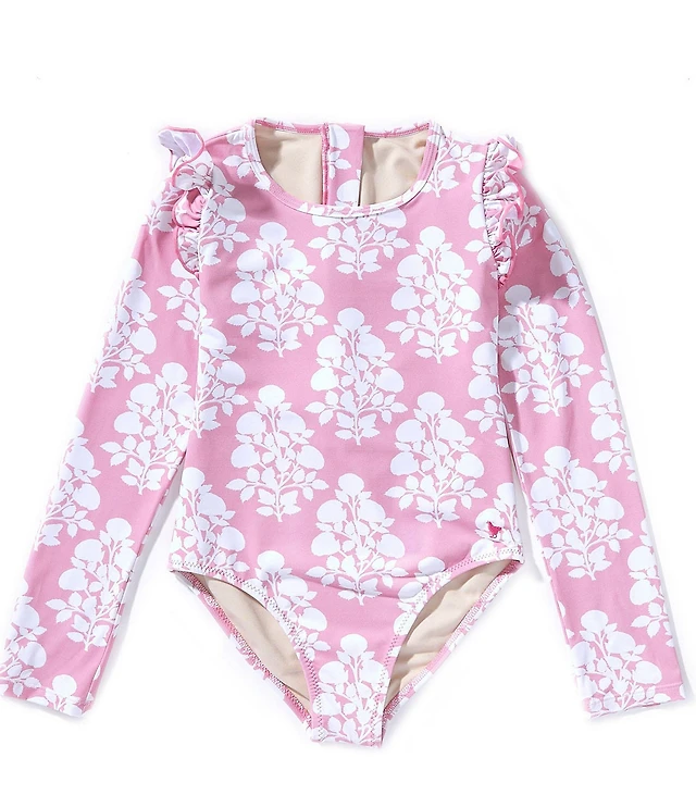 Pink Chicken Little Girls Long Sleeve Ruffle Shoulder Floral One Piece Rachel Rashguard Swimsuit