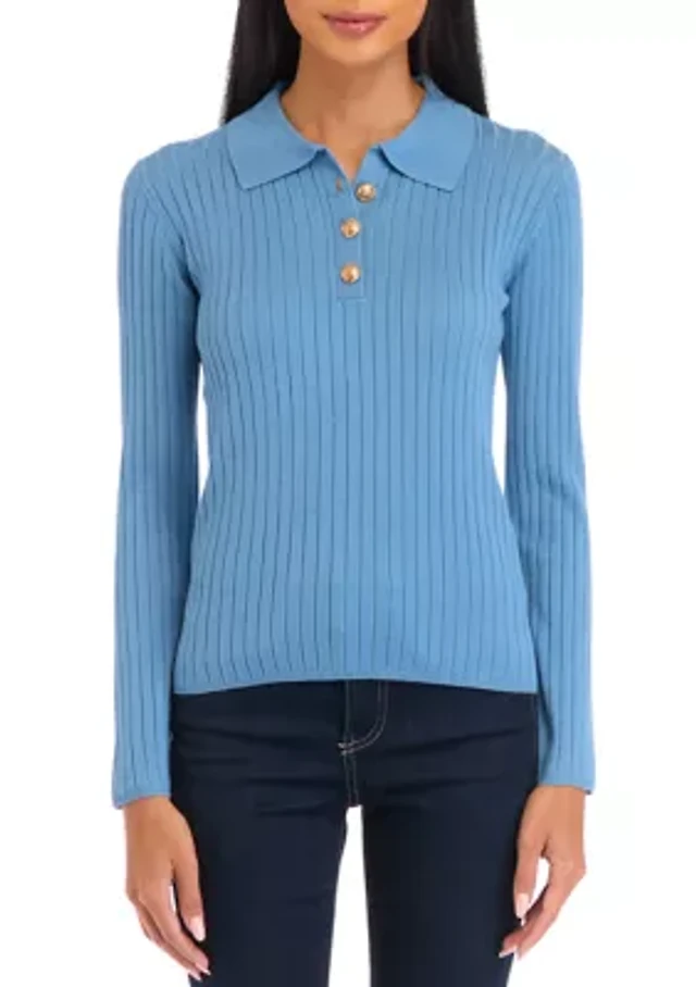 Petite Ribbed Polo Collar Button Placket Sweater