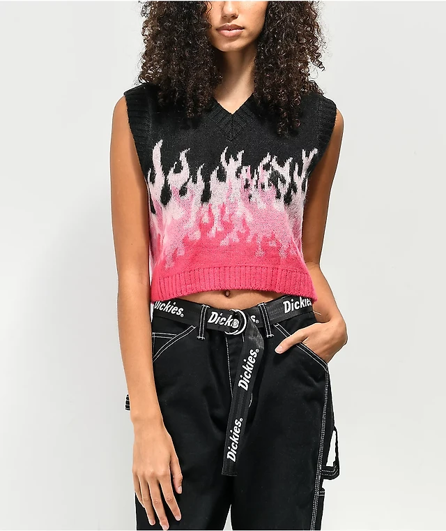 Ragged Priest Burnout Flame Black & Pink Crop Sweater Vest