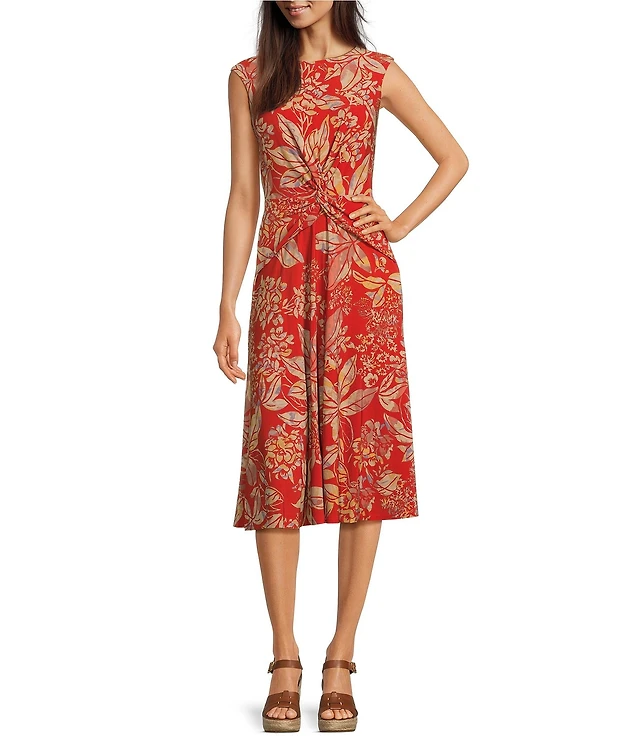Lauren Ralph Lauren Tessanne Floral Motif Stretch Jersey Crew Neck Pleated Twist A-Line Midi Dress