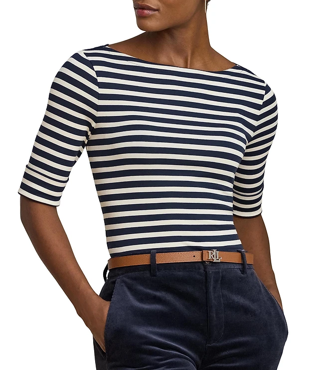 Lauren Ralph Lauren Stretch Cotton Striped Boat Neck Elbow Sleeve Tee