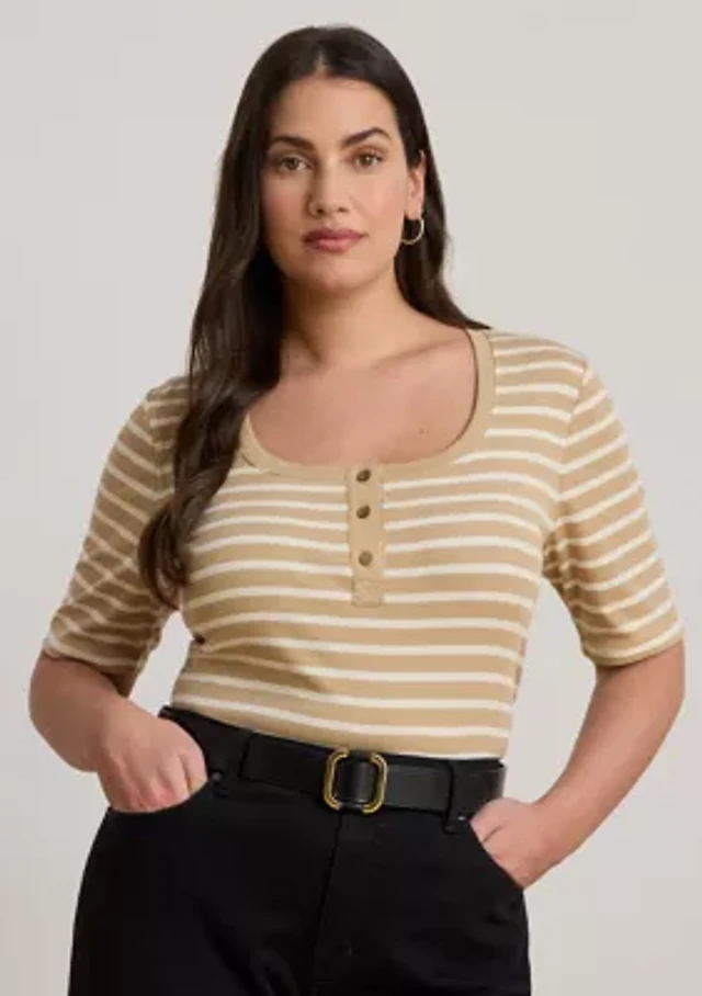 Petite Striped Cotton Elbow Sleeve V-Neck T-Shirt