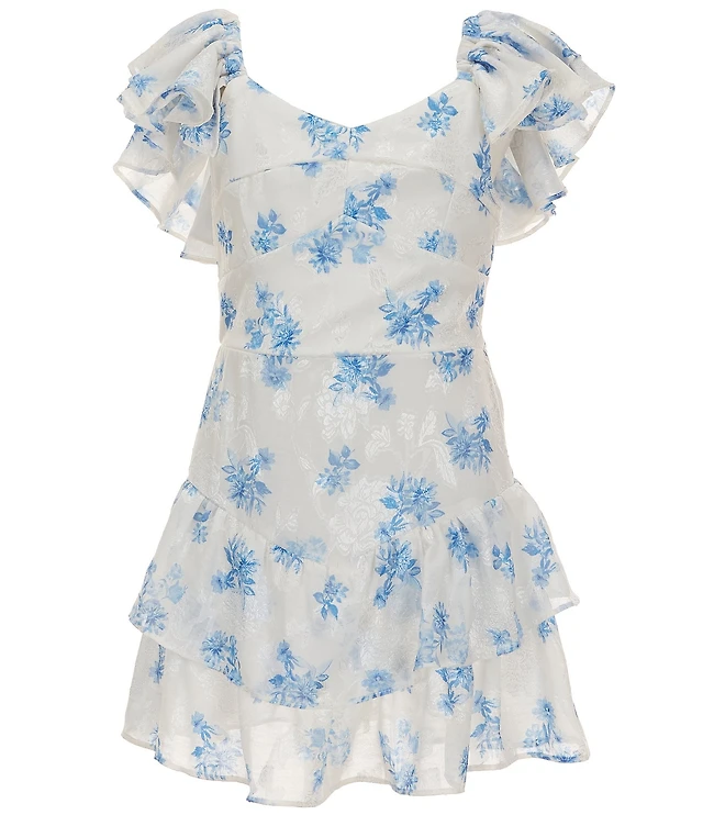 Rare Editions Big Girls Floral Print Short Sleeve V-Waist Ruffle Dress