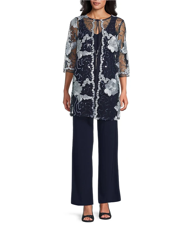 R & M Richards 3/4 Sleeve Round Neck Embellished Sequin Duster Jacket 3-Piece Pant Set