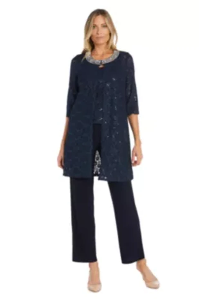 3Pc Duster Pant Set Scallop Edge Jacket And Sleeve W Pearl Sequin Collar Detail Lace Tank Ity