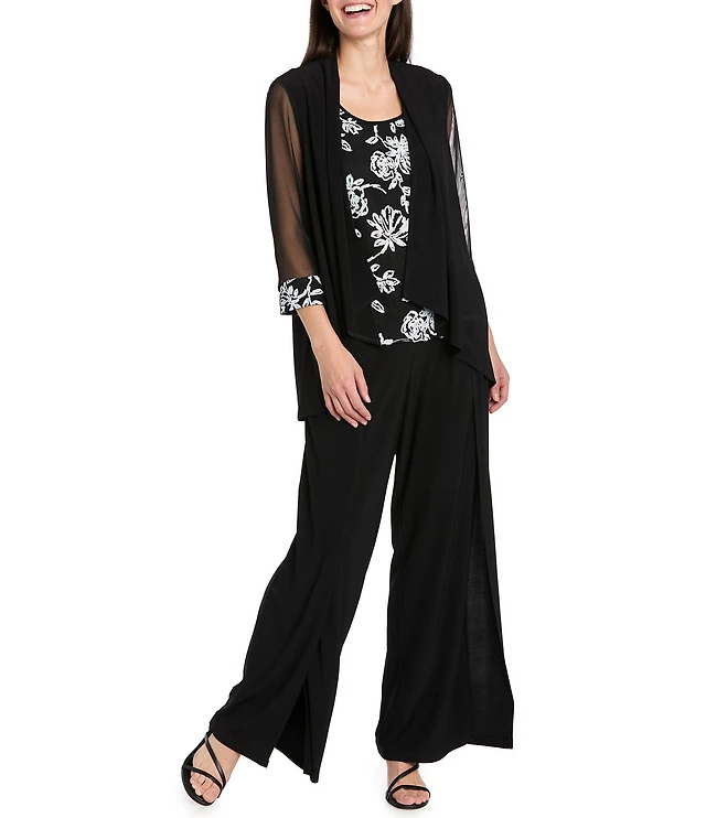 3Pc Pantsuit With Ribbon Soutache Fingertip Cardigan Jacket, Ity Tank Pull On Pants Necklace