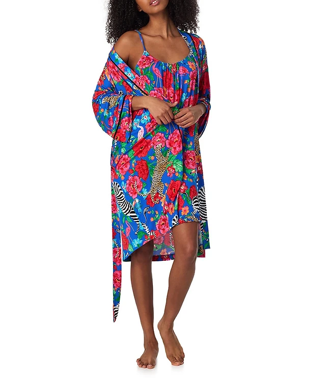 Room Service Safari Floral Print 3/4 Sleeve Jersey Knit Coordinating Short Wrap Robe