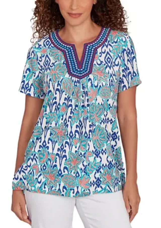 Petite Floral Overlay Ikat Embroidered T-Shirt