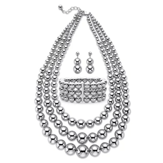 Beaded Silvertone Triple-Strand Necklace, Earring and Bracelet Set 16.5" - 19.5"