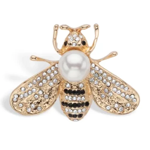 Black and White Crystal Bee Pin With Simulated Pearl Goldtone 1 1/4" Length
