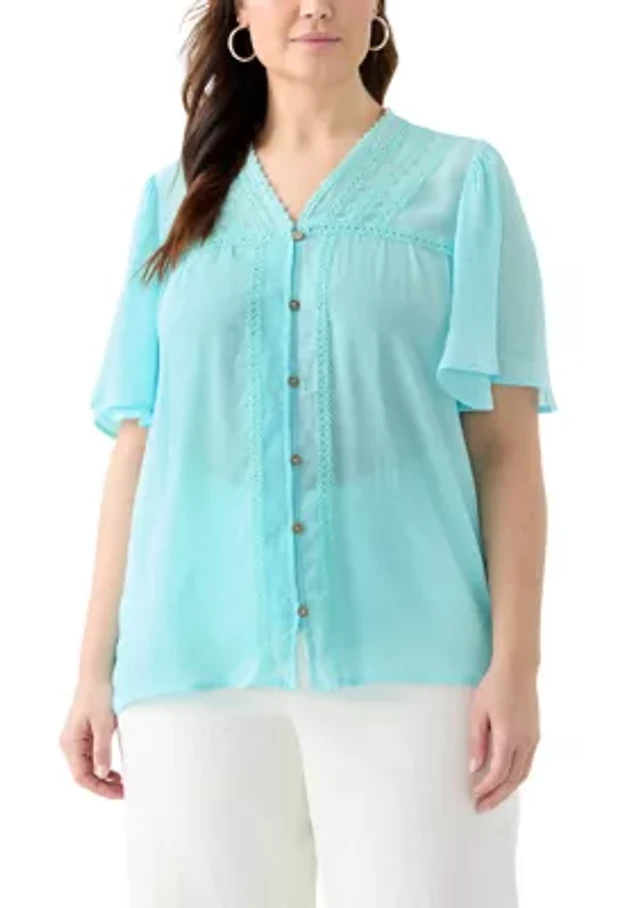 Plus Flutter Sleeve V-Neck Button Down Slub Woven Top