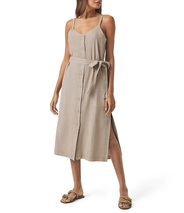 Splendid Amanda Linen Blend Knit V-Neck Sleeveless Belted A-Line Midi Dress