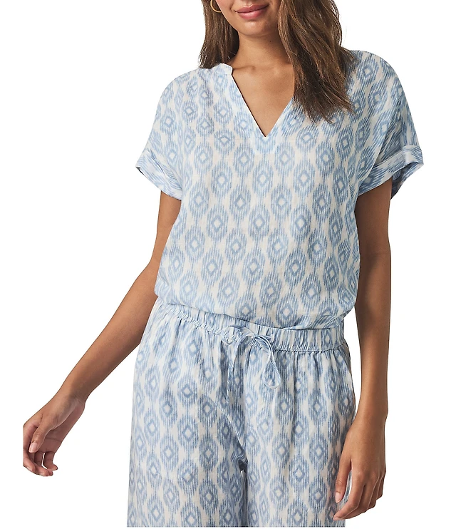 Splendid St. Tropez Woven Ikat Print V-Neck Short Sleeve Coordinating Top