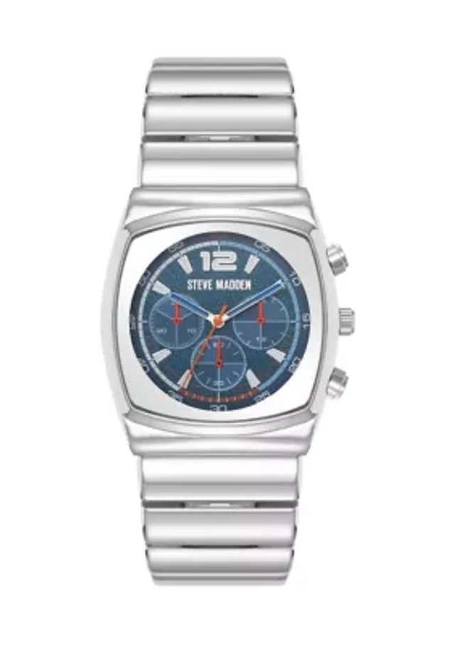 Steve Madden Men's Signature Blue and Brown Faux Leather Silver-Tone Alloy Metal Watch, 45mm