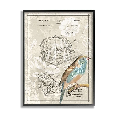 Stupell Industries Antique Bird House Patent Vintage Tree Florals Rosy-Finch Framed Wall Art