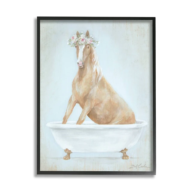 Stupell Industries Country Horse in Farm Bathtub Pink Floral Crown Framed Wall Art