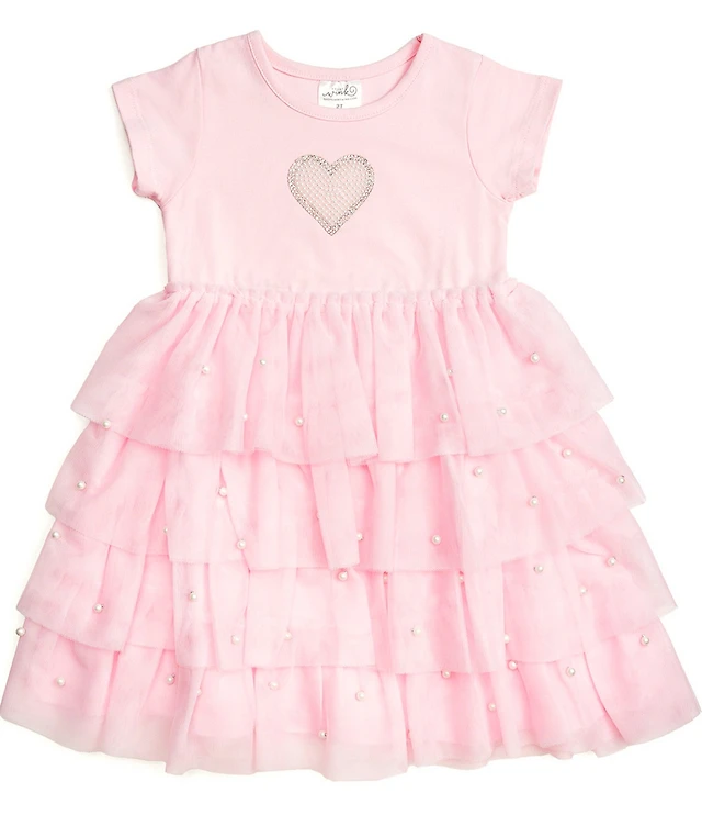 Sweet Wink Little Girls Short Sleeve Faux-Pearl-Heart-Accented/Tulle-Skirted Fit-And-Flare Dress