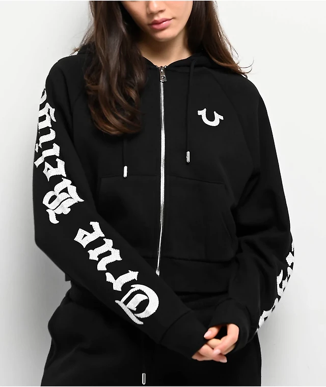 True Religion Big T Shrunken Black Crop Zip Hoodie