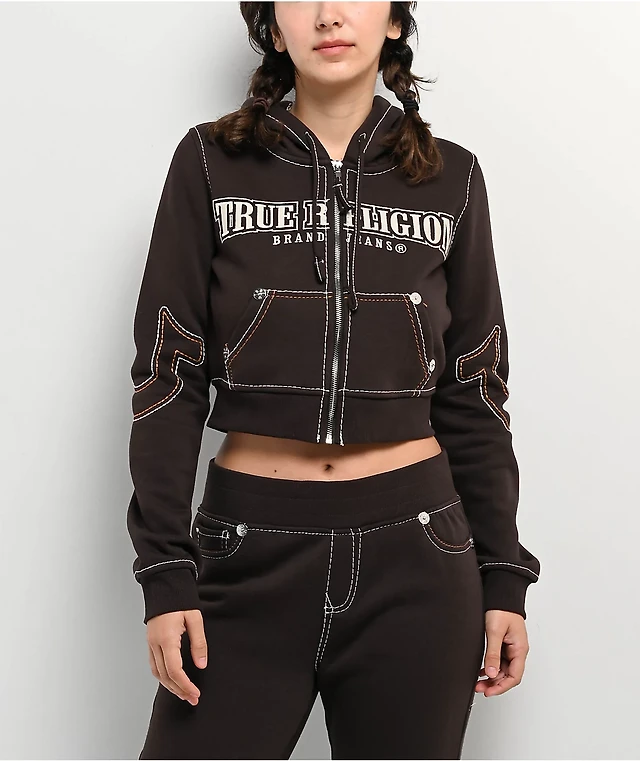 True Religion Shrunken Big T Brown Crop Zip Hoodie