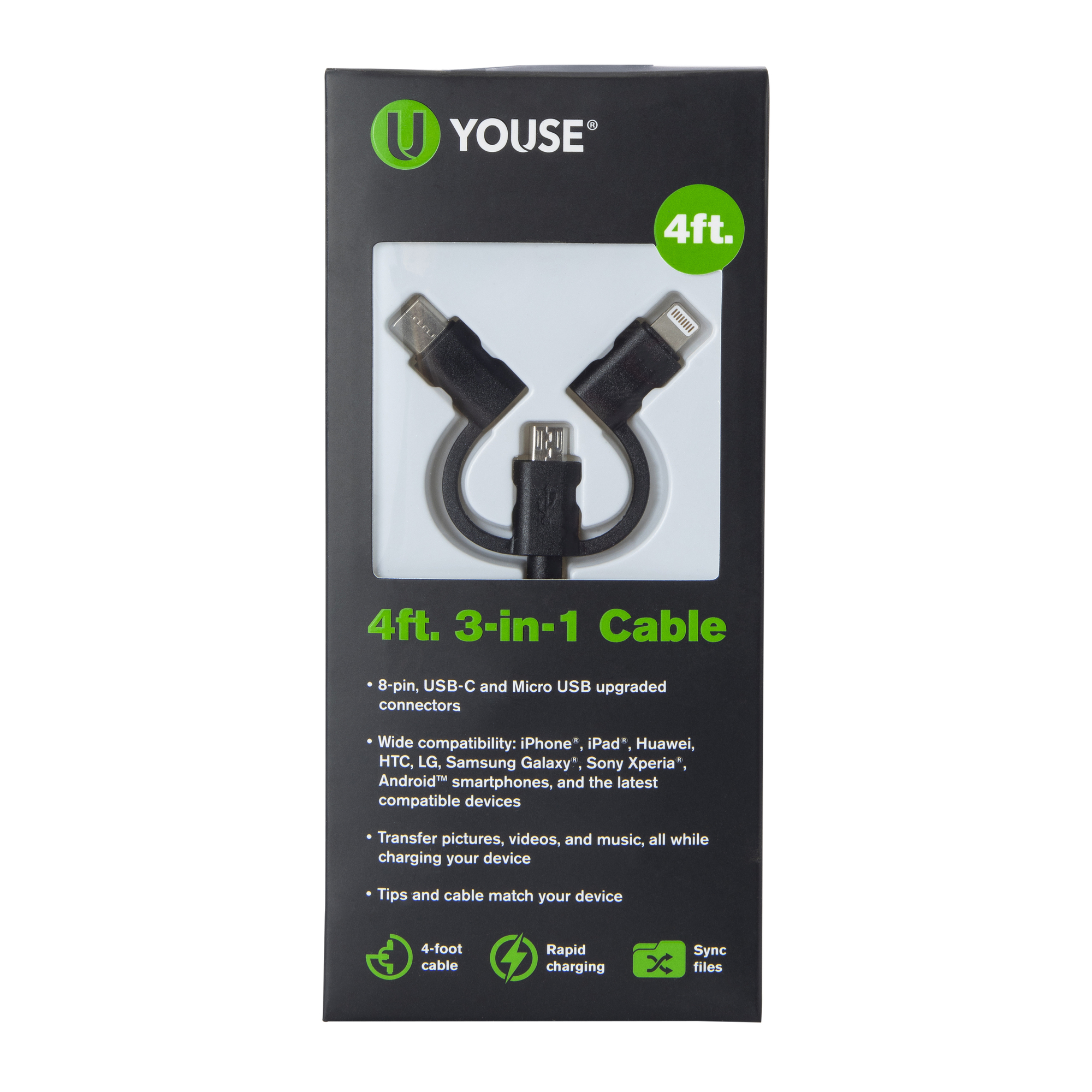 4ft 3-in-1 Charging Cable: 8-Pin, USB-C, Micro-USB