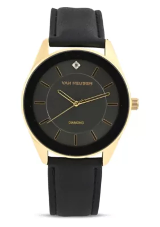 Van Heusen Adult Mens Analog Watch with Two-Tone Gold Black Case and Black Strap w Genuine Diamond at 12 Model# VAN5626