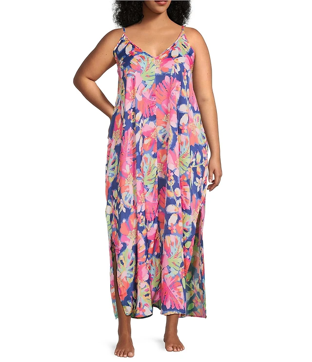 VAN WINKLE & CO. Plus Size Woven Satin Paradise Multi Print Sleeveless V-Neck Maxi Chemise