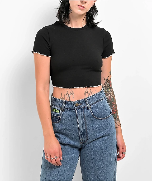 Zine Angie Lettuce Hem Black Crop T-Shirt