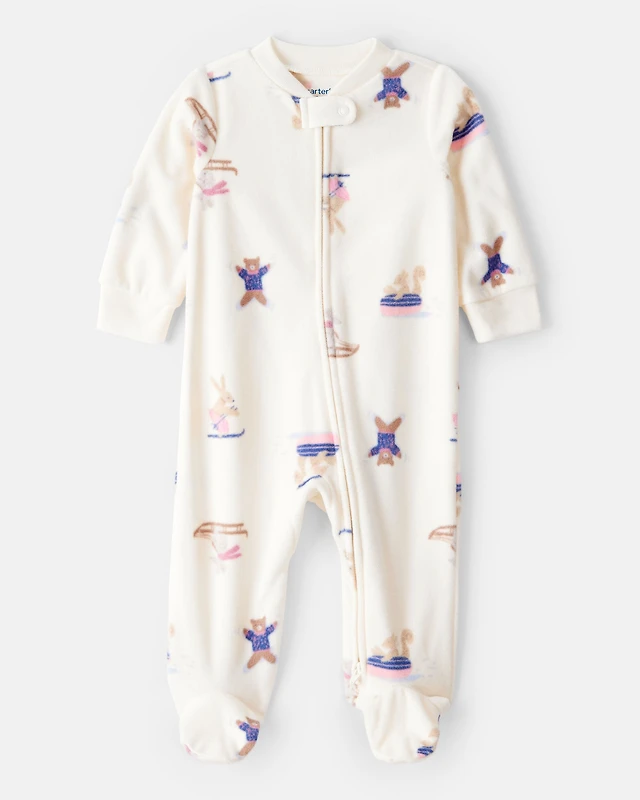Baby Girl Animal Ski Print Loose Fit Long-Sleeve Sleep & Play Pajamas - Cream