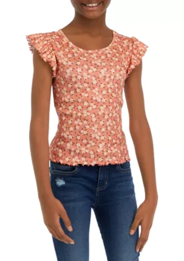 Girls 7-16 Antique Floral Printed Lace Trim Top