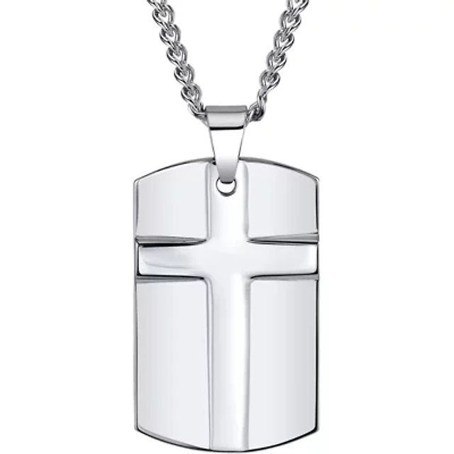 Mens Stainless Steel Cable Cross & Black IP Dog Tag Pendant Necklace