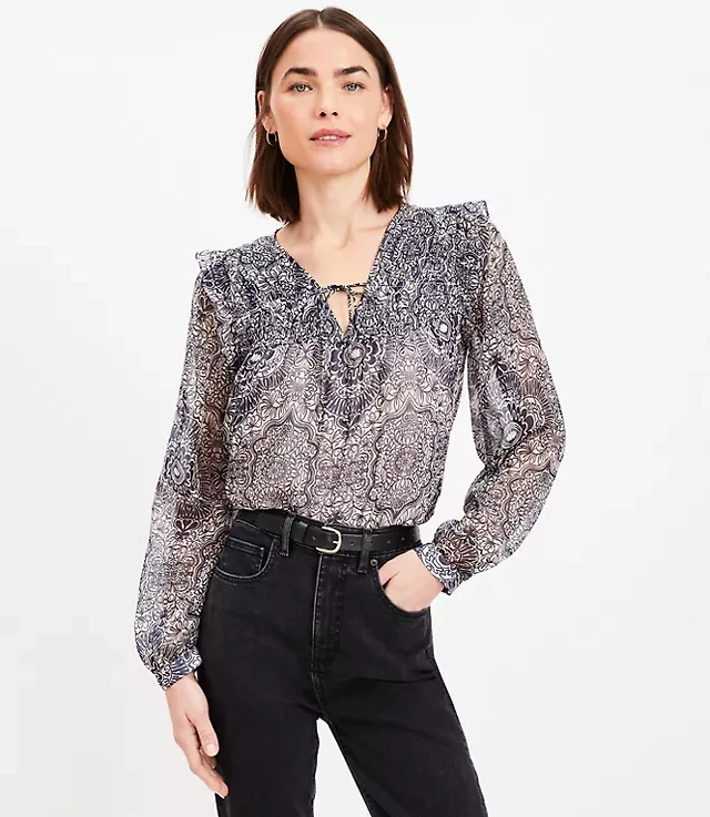 Petite Ornamental Floral Shirred Tie Neck Blouse