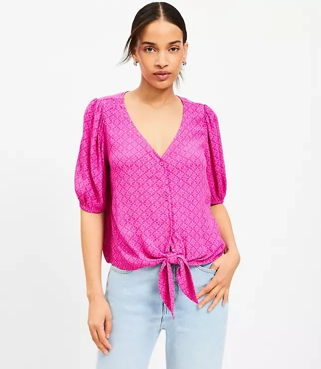 Stamped Puff Sleeve Tie Front Blouse