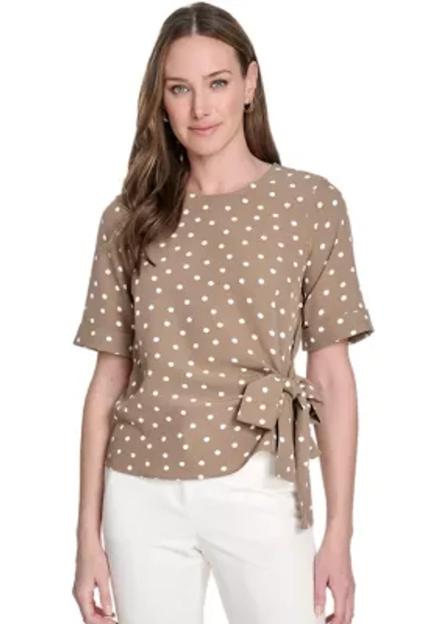 Petite Three Quarter Sleeve Tie Neck Knit Top