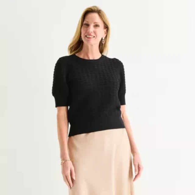 Liz Claiborne Womens Crew Neck Short Sleeve Floral Pullover Sweater