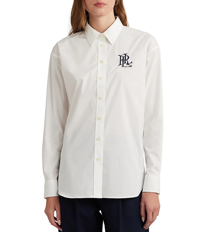 Lauren Ralph Lauren Stretch Cotton Point Collar Long Sleeve Embroidered Logo Shirt