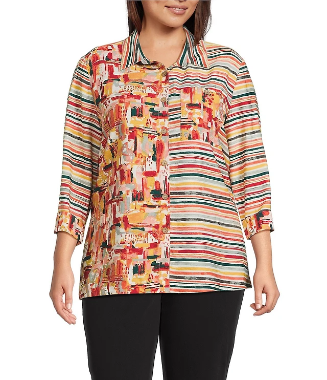 Tara Jarmon Tania Coordinating Geometric Daisy Print Horizon Point Collar 3 Button Placket Short Sleeve Shirt