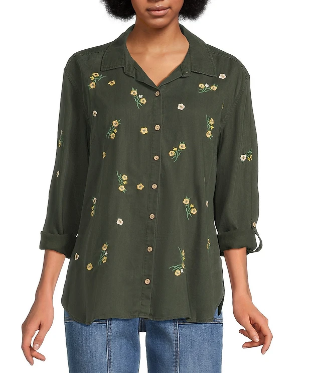 Karyn Seo Alanis Tonal Floral Embroidered Collared 3/4 Wide Sleeve Tie Front Blouse