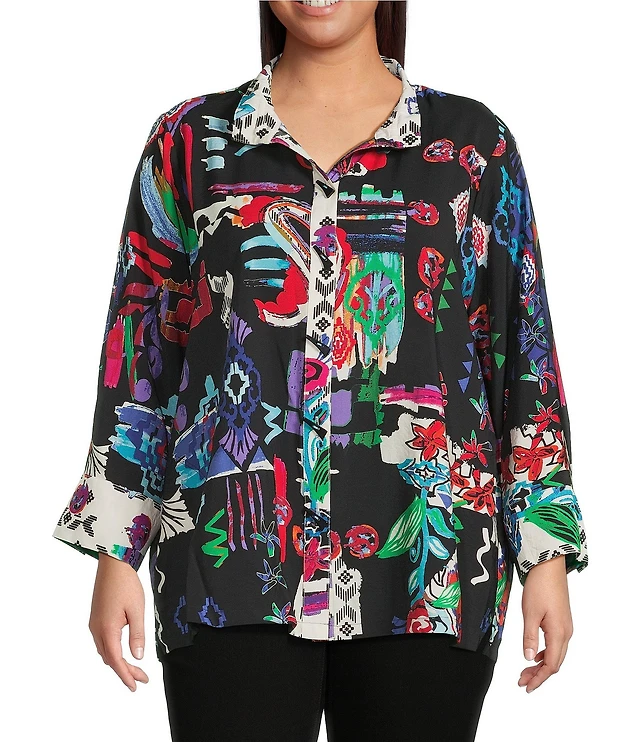 Investments Plus Size Abstract Leaves Dolman Long Sleeve Button Front Point Collar Blouse