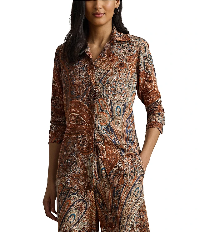 Lauren Ralph Lauren Petite Size Crepe de Chine Paisley Point Collar Long Sleeve Button-Front Shirt