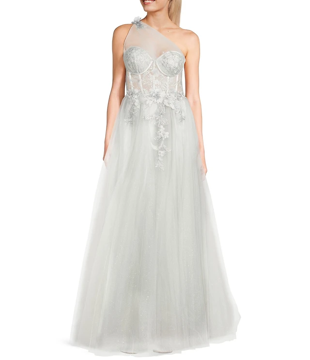 Mac Duggal Metallic Ruffle One Shoulder Short Sleeve Gown