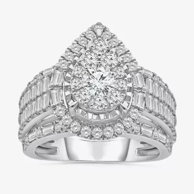 (I / I1) Womens 2 CT. T.W. Lab Grown White Diamond 10K Gold Pear Side Stone Halo Engagement Ring