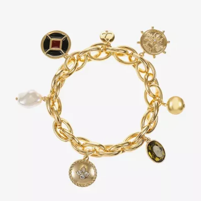 Liz Claiborne Gold Tone Nautical Womens Glass Simulated Pearl Charm Bracelet