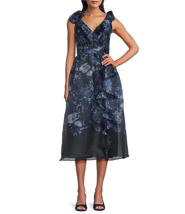 Ignite Evenings Floral Foil Print Chiffon V-Neck Sleeveless A-Line Dress With Removable Cascade Chiffon Jacket