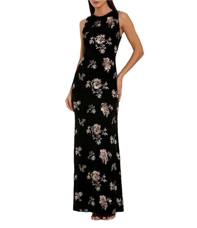 Mac Duggal Floral Embellished Velvet Sleeveless Sheath Gown