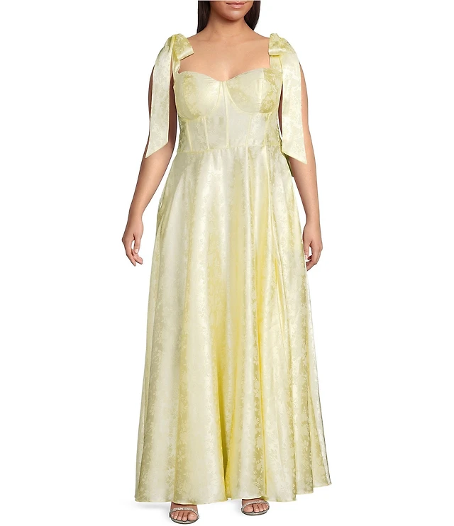 B. Darlin Plus Size Satin Jacquard Sweetheart Neck Tie Shoulder A-Line Gown