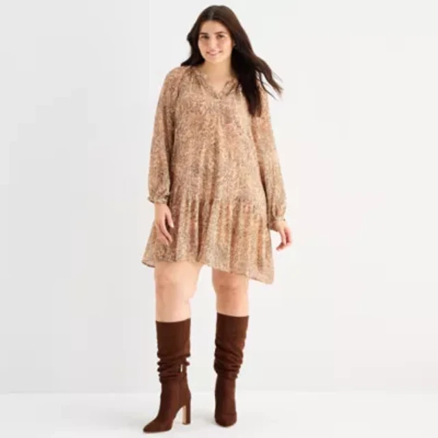Melonie T Womens Long Sleeve Plus Floral Velvet Babydoll Dress