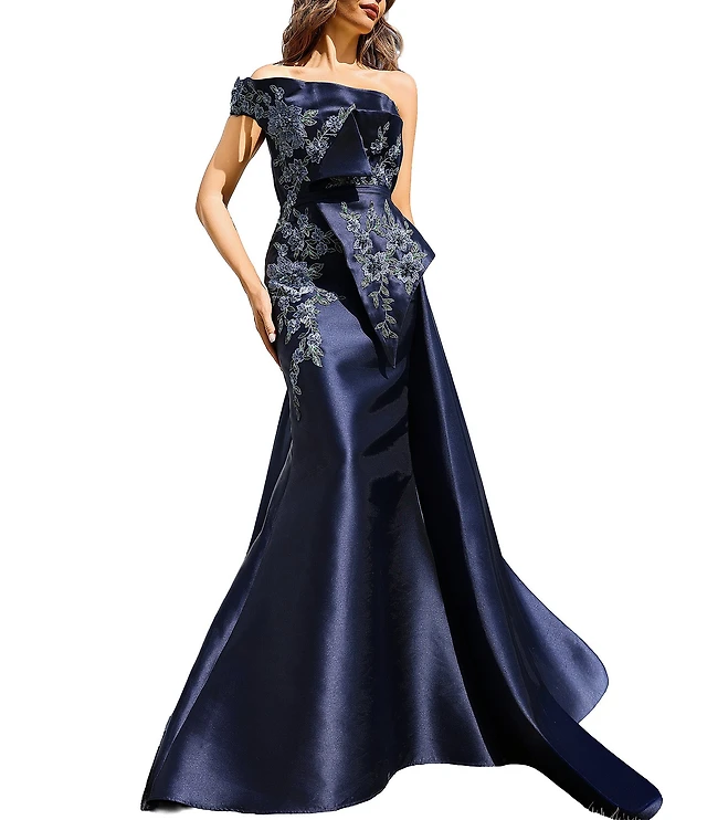 Terani Couture Ruffle Off The Shoulder Sequin Satin Gown