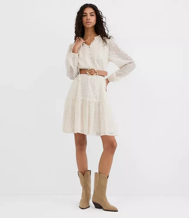 Petite Eyelet Tie Neck Flounce Mini Pocket Dress