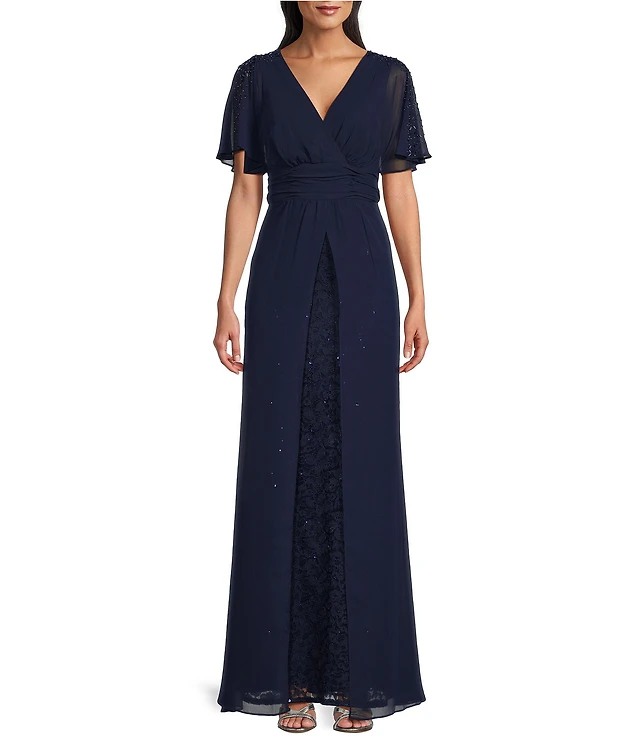 Alex Evenings Plus Size Embellished Short Flutter Sleeve V-Neck Ruched Waist Empire Waist Gown