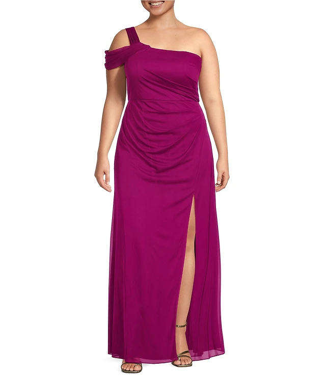 Mac Duggal Embellished Mesh Inset Satin Ruched One Shoulder Sleeveless Draped Gown